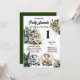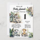 Una divertida y moderna gráfica 3D generada por inteligencia artificial que presenta a un bebé elefante y una jirafa lindos y adorables, cada uno conduciendo su propio vehículo de safari; usando sombreros coloniales de ala ancha sobre un fondo blanco que tiene plantillas de texto personalizadas y vegetación de hojas grandes. Una gran plantilla negra para la edad del niño o niña cumpleañero puede ser personalizada; mientras que la parte trasera es un verde bosque oscuro. Estos son ideales para cualquier tema de fiesta de cumpleaños de verano de jungla, safari, animales salvajes o vida silvestre para niños. Las descargas instantáneas incluyen tanto el frente como la parte trasera de la invitación.