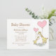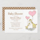 Elegante invitación a la ducha de bebé hecha en blanco, con obras de arte de mamás y jirafas de bebés sosteniendo globos de corazón rosado. La parte de atrás de la invitación está hecha en marrón con puntos de polka blanco. Personalice todo el texto del personalizado para adaptarlo a sus necesidades de eventos.