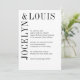 Invitación nupcial moderna con un diseño minimalista en blanco y negro con sus nombres en una fuente grande a lo largo del lado izquierdo y superior. La espalda tiene su monograma. Este diseño es lo suficientemente sencillo para un boda formal, pero hace una declaración audaz.