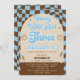 Joven retro, salvaje y tres chicos tercera invitación a la fiesta de cumpleaños - Groovy Boho Smiley Face Tema prepárense para el fiesta con esta atrevida y juguetona invitación retro "Joven, salvaje y de tres" chicos a la fiesta de cumpleaños 3! Diseñado para tu pequeño y genial tipo, esta invitación editable combina el estilo de boho cumpleaños con vibrantes vibraciones de punk retro-hippie, lo que lo convierte en la elección perfecta para padres de moda que planean una celebración divertida y única. Con un divertido fondo de tablero de ajedrez ondulado en azul claro, mocha marrón y crema, este diseño da vida a la energía retro. Caras sonrientes — incluyendo una cara feliz con ojos brillantes — agregan el toque perfecto de personalidad para un cumpleaños de cara sonriente o un tema feliz de cumpleaños facial. Esta invitación editable de fiesta de 3er cumpleaños para niños es muy fácil de personalizar con los detalles de tu evento. Ya sea que busques ideas de fiestas de tercer cumpleaños para los chicos o que solamente quieras algo diferente y genial, esta invitación a los chicos de tercer cumpleaños marca la pauta para una celebración memorable y de moda. Perfecto para: Joven retro Wild & Three Birthday Theme Boys 3º cumpleaños Invitaciones Editables Tercer cumpleaños Invitación Cara sonriente o Fiesta de Guay Amigo Boho Boys Ideas de fiesta de cumpleaños