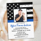 Invitaciones delgadas de graduación de la policía de la Línea Azul o invitaciones de los partidos de retiro de la policía. Celebre años de servicio dedicado, o celebre su nuevo graduado de la academia de policía, e invite a amigos y familiares a su fiesta de aplicación de la ley con esta Invitación a la Retirada de la Policía con Bandera Azul delgada y invitaciones a graduación de la academia de policía - diseño de la bandera norteamericana en colores de la bandera de la policía, diseño angustiado. Esta invitación a la jubilación de oficiales de policía también es perfecta para invitaciones a graduarse en la academia de policía, cambiar de lugar de personalización. Vea nuestra colección para ver regalos de retiro de la policía, regalos de graduación de la policía, favores del partido y suministros. DERECHOS RESERVADOS © 2021 Judy Burrows, Black Dog Art - Todos los derechos reservados. Jubilación policial Invitación de cumplimiento de la ley de la Línea Azul delgada