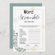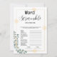 Entretiene a sus invitados con este divertido juego de ducha de novias común - Word Scramble. Bridal Word Scramble es un juego de ducha de novia fácil de disfrutar para huéspedes de todas las edades. Los invitados- jugadores tratan de descifrar las palabras relacionadas con el boda tan rápido como puedan. La tarjeta se crea como plantilla para que pueda cambiar las "palabras revueltas" ya existentes Funciones de diseño de la zona izquierda de la vegetación incorporada en un rectángulo brillante con fondo de color gris negro. Sencillo y elegante. Esta plantilla de juego de ducha de novia combina dos tipos de letra diferentes para obtener un aspecto más dinámico. En funda, necesita ayuda sobre el diseño o cambiar las palabras para ponerse en contacto con la tienda.