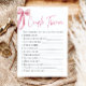 Prepárate para poner tu conocimiento a prueba con "Rubor Pink Bow: She's Tying the Knot"! Este encantador juego de ducha de novias es perfecto para parejas y clientes. A medida que la novia se ata el nudo, veamos qué tan bien conoces el viaje de la pareja juntos. El juego presenta una serie de preguntas triviales que cubren varios aspectos de la relación de la pareja, desde cómo se conocieron hasta sus puntos de cita favoritos y todo lo demás. Cada pregunta está cuidadosamente diseñada para provocar risas, nostalgia y tal vez algunas sorpresas. Cómo Jugar: Reúne a todos los invitados y dividirlos en equipos o jugar individualmente, dependiendo del tamaño del fiesta. Proporcionar a cada equipo o individuo un conjunto de preguntas de la trivia. Dé a los participantes tiempo para discutir y anotar sus respuestas. Una vez que todos hayan respondido a todas las preguntas, revelar las respuestas correctas y sumar las puntuaciones. Premios al equipo o al individuo con las respuestas más correctas. Recuerden, el objetivo de "Rubor Pink Bow: She's Tying the Knot" no es solamente poner a prueba el conocimiento sino celebrar la historia de amor de la pareja y crear recuerdos duraderos. Así que, prepárate para reírse, recordar, y celebrar el viaje del amor con este delicioso juego de ducha de novias!
