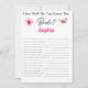 Si buscas un juego divertido e interactivo para la ducha de novias, "¿Qué tan bien conoces a la novia?" es la elección perfecta. El juego está disponible como una versión imprimible o impresa profesionalmente, lo que facilita su incorporación en cualquier tema de ducha de novia. En la parte superior del juego hay una hermosa flor blanca y rosa a la izquierda y una mariposa blanca, violeta y amarilla a la derecha, añadiendo un toque de brillo al diseño. Bajo la pregunta "¿Qué tan bien conoces a la novia?" encontrarás el nombre de la futura novia impreso en un tipo de letra rosa bonito que coincida con la flor. El juego en sí se presenta en un fondo blanco con un texto negro claro, lo que facilita su lectura a todos los clientes. Y con 15 preguntas de personalizable, se puede adaptar el juego para que se ajuste a la personalidad e intereses únicos de la novia. Las preguntas incluidas en el juego abarcan una serie de temas, desde los recuerdos infantiles de la novia hasta sus comidas y aficiones favoritas. Los invitados tendrán que poner a prueba su conocimiento de la novia mientras compiten por ser los primeros en responder correctamente a las 15 preguntas. Es una gran manera de hacer que todos se comprometan y hablen de la novia, creando recuerdos duraderos y risas para todos. En general, "¿Qué tan bien conoce a la novia?" es una adición divertida y entretenida a cualquier celebración de la ducha de novias. Es una buena manera de romper el hielo y hacer que los invitados se mezclen, a la vez que celebran a la futura novia y su personalidad única. Ya sea que elijas imprimir el juego tú mismo o elegir una versión impresa profesionalmente, este juego seguro que será un éxito para todos los invitados.