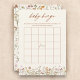 Sumérjase en su ducha de bebé con un encanto excepcional con nuestro juego de Jardín Wildflower Baby Shower Bingo Boho! Inspirado por la belleza de la naturaleza, este juego delicioso le aporta un toque de encanto a su celebración. Cada tarjeta de bingo es una obra de arte que invita a los huéspedes a unirse a la diversión. Simplemente distribuya las tarjetas y observe cómo sus invitados marcan con impaciencia los artículos mientras se abren los regalos. Con su toque lúdico en el juego clásico, Wildflower Baby Shower Bingo trae alegría y emoción a todos los que juegan. Ya sea el primero en completar una fila o el apagón total, este juego seguramente será un éxito, creando recuerdos inolvidables para la futura madre y sus seres queridos. ¡Que florezcan los albornoces del boho garden en tu ducha de bebé con este juego delicioso!