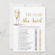 El "Juego de Perlas Doradas y Prosecco: Él dijo, Ella dijo" es un delicioso añadido a tus celebraciones de despedida de soltera. Con elegantes motivos de perlas doradas y prosecco, este juego añade un toque de sofisticación al evento. Los invitados disfrutarán adivinando quién dijo qué mientras comparten anécdotas y recuerdos, lo que hace que sea una experiencia divertida y memorable para todos.