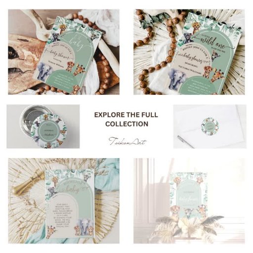Invitación a esta Moda de Sage Green Boho, adornada con Elegantes hojas de eucalipto, con animales de la selva pura: León, Elefante, cebra, jirafa, tigre y mono gracioso. Este diseño es perfecto para un Baby Shower neutral en cuanto a género. No olvides explorar la colección completa.