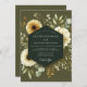 Embrace a mood of rustic elegance with this sophisticated botanical design, set against a deep khaki green backdrop. Lush, creamy white chrysanthemums and pale golden blooms are artistically arranged with muted eucalyptus and sage greenery. This earthy and romantic composition is perfect for a stylish autumn or vintage-themed affair.
