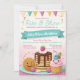 La invitación tiene un tema de desayuno, ilustrado por una pila de crepes felices con una palmada de mantequilla y jarabe encima, junto con un alegre quequito con un torbellino de hielo rosa y una cereza. Los colores son suaves y pastel, con tonos rosas, azules y amarillos, y un fondo azul claro en la parte superior con puntos de polka sutiles y una mitad inferior rosa. Elementos fiestas como confetti y gorras fiestas están dispersos, sugiriendo un ánimo de celebración. Los gráficos son caricaturistas y amigables, diseñados para atraer a un evento amigable con los niños. El diseño general transmite una sensación de alegría y festividad matutina.