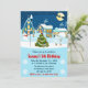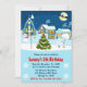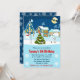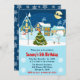 Snowy Winter Navidades Village Scene design con un muñeco de nieve y un árbol de navidad, y el trineo de santa en el cielo, sobre un fondo azul