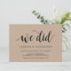 Esta tarjeta de invitación temática Kraft de granja rústica (Nosotros lo hicimos) es perfecta para la celebración de su elopement de boda / fiesta de anuncio. Agregue sus detalles en la misma letra negra.