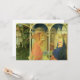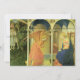 La Anunciación del Prado por Fra Angelico, c.1435. La escena está dividida en tres partes, el jardín, el arco del Ángel y el arco de la Virgen. Adán y Eva están siendo expulsados del Jardín del Edén y un rayo de luz divina ilumina a través de la paloma del Espíritu Santo, la Virgen, que se inclina aceptando su deber sumisamente.