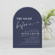 Fije el tono para una elegante velada con esta invitación a la cena de ensayo azul de la Marina Arch. Con un diseño de arco elegante en un profundo matiz azul marino, esta invitación añade sofisticación y encanto a su celebración nocturna. Completamente personalizable, es fácil de personalizar con los detalles de tu evento. Ya sea que se imprima en casa o profesionalmente, este elegante diseño le garantiza un toque elegante y memorable para su reunión especial de bodas.