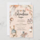 Una encantadora invitación a la ducha de bebé con un estilo boho que mezcla artículos para bebés de oso de peluche con traje de cuerpo, biberón y zapatos para bebés con flores y plumas, en tonos melocotón y marrón crema.