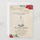 Esta mágica y encantadora invitación a la fiesta incluye un tema vintage de Beauty y Beast de cuento de hadas. El fondo es de estilo rústico, con un diseño de papel pergamino descolorido. La frase "Érase una vez" se imprime en la parte superior con un patrón de purpurina dorado, tipo de letra vintage. Las bonitas rosas rojas con acentos dorados se colocan en las esquinas superior derecha e inferior izquierda. En el centro se encuentra una imagen de un rosa mágico en un funda de vidrio. La imprenta está diseñada para parecerse a un libro de cuentos de cuentos de cuentos de hadas.