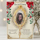 Esta elegante y encantadora invitación a la fiesta incluye un tema de los cuentos de belleza y bestia. En el centro se ha colocado un espejo mágico de acuarela con una foto de muestra en el interior y enmarcada con un borde de purpurina dorado. Puede personalizar la invitación para incluir su propia foto personalizado e información de fiesta. La belleza y la bestia inspiraron rosas rojas y viñas que acentúan los lados y un marco dorado de estilo vintage forma una frontera caprichosa. La icónica frase de cuento de hadas "Be Our Guest" se imprime encima del espejo.