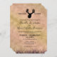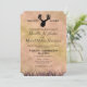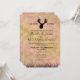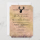 Elegante y rústico, "La caza ha terminado" invitación a la boda. La silueta de la cabeza del trofeo de ciervos en la parte superior con las palabras "La caza ha terminado" que lo rodean. El fondo es un gradiente del cielo de rosa y crema marrón claro con un campo de pasto degradado de rosa a negro. Pista dibujada por ©Tina Hesskew de Fishing Hunting Life.