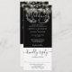 Invitación de boda todo en uno con luces de cuerda de bonito y tipografía elegante en un fondo negro. La invitación incluye una tarjeta RSVP que se puede cortar y detalles de la información de los invitados. Diseñado por Thisisnotme©