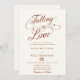 Una romántica y elegante plantilla de bodas, sencilla, elegante y moderna para los meses de otoño, septiembre, octubre, noviembre. Presenta una caligrafía de escritura moderna y elegante con abundantes florecientes y el título "enamorarse" y una rama simple de hojas caídas, abedul de cobre. Lujoso pero sencillo, clásico pero moda, moderno pero atemporal. Una encantadora elección para un boda otoño o otoño con cobre, naranja quemado, terracota, beige, rojo, naranja y otros tonos otoño.