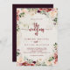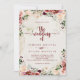 El rústico boda de invitación floral de verano es perfecto para un boda sencillo. El diseño se compone de flores de color burdeos, rosa y azul con hojas verdes en un fondo manchado de color marrón.