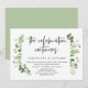 Moderna Tarjeta de Invitación de Boda a Escondidas con tema de vegetación de jardín de verano y letra script negra (La celebración continúa). Es perfecta para la recepción de su boda a escondidas o fiesta de celebración después de la boda. Agregue sus detalles en fuente / letra negra a juego.