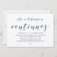 Tarjeta de invitación de elopamiento nupcial con tema de escritura moderna en azul marino (La celebración continúa). Es perfecta para su recepción de elopamiento nupcial / fiesta de celebración post nupcial. Agregue sus detalles en fuente / letra negra a juego.