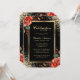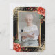 Elegante foto en negro y oro de la invitación a la vida con un marco dorado adornado con rosas rojas y purpurinas en la parte delantera y una foto en la parte trasera.