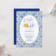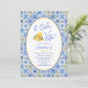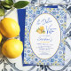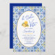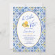 Invitación a una fiesta de cumpleaños con un elegante tema "La Dolce Vita" con motivos de azulejos mediterráneos de moda en azul, blanco y amarillo con ilustraciones de gelato de limón cítrico, recordándole las vacaciones de verano en el sur de Italia. No dudes en enviarme un mensaje si necesitas ayuda para personalizarlo.