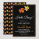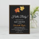 Esta elegante ducha de bebé de otoño es perfecta para una moderna ducha de bebé de otoño. El diseño sencillo presenta hojas de arce de otoño con una tipografía blanca y naranja elegante sobre un fondo negro.