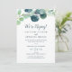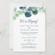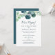 Esta exuberante tarjeta de recepción de vegetación y eucaliptos es perfecta para un elegante fiesta de postigos de patio trasero. El moderno diseño botánico presenta magníficos eucaliptos de color azul acuático y hojas verdes. Las tarjetas RSVP se venden por separado.