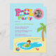 Esta invitación de la fiesta de cumpleaños de la foto de la fiesta en la piscina del chica adorable y lindo tiene la fiesta en la piscina escrita en el top con uces par de anillos de la piscina como los o. A la derecha, hay un lugar para que su añada una fotografía. En la parte inferior, hay un chica marrón lindo del pelo que se sienta en una balsa flotante en una piscina. Hay algunos zapatos del flip-flop, una limonada, y una pelota de playa alrededor del borde de la piscina. En el centro, usted puede modificar fácilmente toda la información del fiesta para requisitos particulares. Gráficos por los ilustraciones de JW
