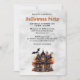 Invitación a la fiesta de Halloween con ilustraciones de acuarela de una casa embrujada, murciélagos, calabazas y una linterna de jack o’lantern usando un gorra de brujas.