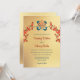 Esta invitación a la boda tibetana incluye un nudo infinito dorado y flores rojas y un fondo dorado.