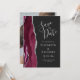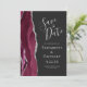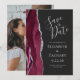Esta elegante y moderna tarjeta de fecha guarda un batido de color burdeos con un borde geodésico adornado con un falso purpurina plateado. El texto gris plateado aparece en un fondo no negro. Sustituir fácilmente la imagen de muestra en el reverso por una foto vertical del futuro novio y novia.
