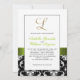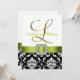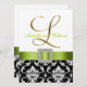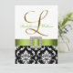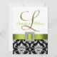 La elegancia sofisticada es transportada por este diseño hermoso de la invitación del boda. Un modelo floral blanco y negro del damasco sirve como fondo para un efecto de la foto de la inicial metálica "L" del oro y de una broche de la cinta de satén y del diamante de la verde lima IMPRESA TODO en invitaciones PLANAS de la boda de la TARJETA. Una de manera perfecta de invitar a sus huéspedes a su boda. El contemporáneo, con todo el modelo clásico del damasco con un diseño que permita que usted personalice el frente con sus nombres y la parte posterior está libres de añadir su texto modificado para requisitos particulares de la invitación que se casa. La invitación de la boda se fija para la inicial "L" del monograma. Para otras letras y colores satisfaga entran en contacto con al diseñador en luxuryweddinginvitations@gmail.com. Diseño de la disposición de Elke Clarke©. Gráficos autorizados. ¡También, elija de una variedad de fuentes y de papeles hermosos hacer sus invitaciones del boda PERFECTAS!