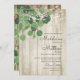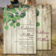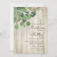 Una rama sencilla de hojas de eucalipto verde sobre un fondo rústico de madera y luces. Elegante y elegante invitación personalizado boda. Cambie fácilmente la información para su propio diseño personalizado.