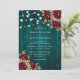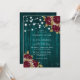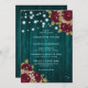 Invitaciones caseras rústicas, verde azuladas y burdeos, con rosas y bebés en un fondo de madera de granero adornado con luces de cuerda. Perfecto diseño de tarjetas para invitar a sus invitados a su fiesta de bodas rústica y verde azulada. Artículos de juego disponibles para complementar estas invitaciones rústicas verde azuladas y burdeos de boda floral.