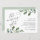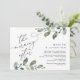 Hermoso diseño romántico moderno, en tema de acuarela de hojas de eucalipto, Anuncio de boda de Elopamiento, Tarjeta de invitación (La mañana después). Esto es perfecto para la recepción de su boda y la fiesta de celebración después de la boda. Agregue los detalles de su celebración de brunch / cena de elopamiento.
