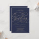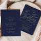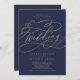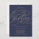 Esta romántica marina de caligrafía dorada en una sola invitación matrimonial es perfecta para un simple boda. El moderno diseño clásico presenta vistosos remolinos y florituras con una preciosa y elegante tipografía de Relieve metalizado de oro con chaflán a mano con letras falsas y oro. Guarde el papel incluyendo los detalles en la parte posterior de la invitación a la boda en lugar de en una tarjeta separada. Incluya también la información de RSVP si su invitado responderá electrónicamente (opcional). Nota: Este diseño no tiene Relieve metalizado oro real. Es un gráfico de alta calidad hecho para parecer un Relieve metalizado dorado.