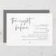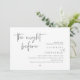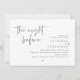 Anuncie su gusto después con estilo con nuestro moderno diseño temático (La noche antes) boda de la carta de invitación a la celebración del ensayo. Es ideal para las parejas que han decidido celebrar la noche anterior a su gran día. Con un diseño sofisticado pero lúdico, esta invitación seguramente marcará el tono para un evento inolvidable. La tarjeta de invitación incluye un moderno diseño de escritura romántico, añadiendo un toque de elegancia eterna a tu celebración. Diseñado por TeeshaDerrick