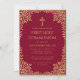Esta elegante invitación burdeos y dorada a la primera comunión con un aire vintage, recomendada para un chica, tiene un marco ornamental de Relieve metalizado de oro falso con ramas serpenteantes con hojas de oro sobre un fondo borgoñoso. Encima del texto hay una cruz religiosa en falso Relieve metalizado de oro. Todo el texto puede ser personalizado y tiene un color amarillo dorado similar al marco falso dorado. El marco vintage y ornamentado de hojas doradas se basa en un enlace de portada de libros antiguos, "The XVIII Century its Institutions, Personalizados, and Costumes" de Paul LaCroix, publicado en 1876, ahora de dominio público.