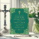 Esta invitación a la primera comunión, de color verde esmeralda y oro, con aire vintage, tiene un marco ornamental de Relieve metalizado de oro falso con hojas de oro sobre un fondo verde esmeralda. Encima del texto hay una cruz religiosa en falso Relieve metalizado de oro. Todo el texto puede ser personalizado y tiene un color amarillo dorado similar al marco falso dorado. El marco vintage y ornamentado de hojas doradas se basa en un enlace de portada de libros antiguos, "The XVIII Century its Institutions, Personalizados, and Costumes" de Paul LaCroix, publicado en 1876, ahora de dominio público.