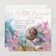 Invitación a la ducha de bebé de sirena afroamericana con adorable bebé sirena dormido descansando en una hermosa concha rodeada de perlas, arena, coral y plantas submarinas.