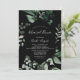 Esta invitación a una cena de color negro esmeralda es perfecta para un ensayo boda boho. El diseño es elegante y rústico, con unas hojas de acuarela verde oscuro y un eucalipto con un toque bohemio moderno.