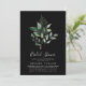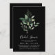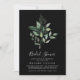 Esta invitación a una ducha de novia negra de esmeralda es perfecta para una ducha boho. El diseño es elegante y rústico, con unas hojas de acuarela verde oscuro y un eucalipto con un toque bohemio moderno.