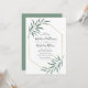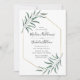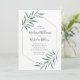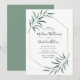 Elegante y moderna invitación a las bodas con detalles bodas rodeados por un falso marco geométrico de Relieve metalizado dorado con hojas de acuarela adornando las esquinas. El reverso presenta un fondo verde sólido. Diseñado para coordinar con nuestra colección de bodas Modern Greenery.