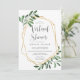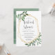 ¿Planear una ducha virtual en lugar de un evento en persona? Reúne a sus seres queridos con estas hermosas invitaciones a la novia o a la ducha de bebés con un tema de follaje de bosque. El diseño presenta letras grises enmarcadas por un falso borde geométrico de oro y un rico follaje de acuarela verde, hojas y bayas blancas. Una opción moderna en un esquema de color natural para duchas de novias o bebés con temas de naturaleza o boho, puede usar los campos de texto de plantilla para agregar detalles de su reunión virtual, incluyendo video chat o enlace de videoconferencia, información del registro y dirección postal.