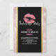 Invitación para una fiesta de despedida de soltera con un fondo compuesto de hojas tropicales de oro rosa modernas y de moda. Superpuesto en la parte superior hay un marco negro con un borde de gradiente dorado, dentro hay labios brillantes de color rosa.