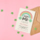 Afortunada invitación de un cumpleaños con cuatro tréboles de hojas verdes y un arcoíris brillante en colores bonitos. Invitación a la fiesta de primer cumpleaños temática del Día de San Patricio en rosa con un arcoiris bonito y cuatro tréboles de hojas. Afortunada, una invitación para una fiesta de cumpleaños con cuatro tréboles hoja y el nombre de tu hija en rosa. Chica con suerte una invitación de cumpleaños con cuatro tréboles hoja. Afortunada invitación de un cumpleaños sin foto.