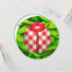 Una mariquita de gingham roja y blanca se encuentra sobre un fondo verde brillante de césped seco. Se podría usar para un picnic, un fiesta de una niña o una ducha para bebés.